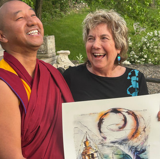 I explained how I work in order to find my paintings. I use my body as a conduit in order to communicate with the earth. I imagine roots emerging from my feet into the earth and I open the crown of my head to let in sky energy. Then I pour the energy out of my hand onto the canvas. Rinpoche nodded and said, oh, same as we do.