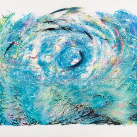 In these prints, I use viscosity monoprints to add explosions of color, and a sense of time moving inexorably toward an unknown future. These layered worlds are visions of what can emerge from chaos, an unexpected earth transformed by possibility.
